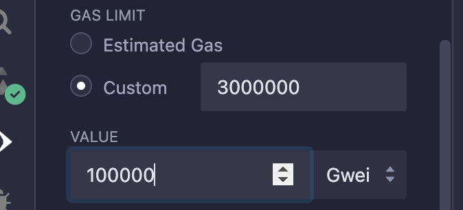 同时切换gaslimit到custom, 保证每次有足够的gas去执行交易。(100000 Gwei = 0.0001eth)