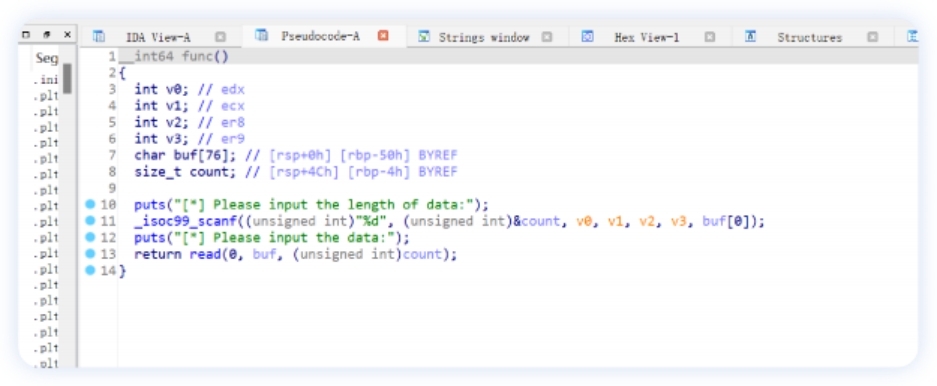 IDA反汇编观察有一个溢出点在 func 函数⾥: