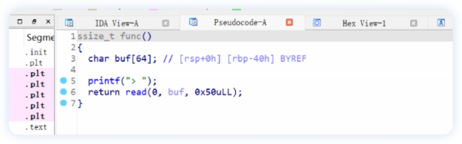IDA反汇编, 查看func函数有⼀个溢出点: